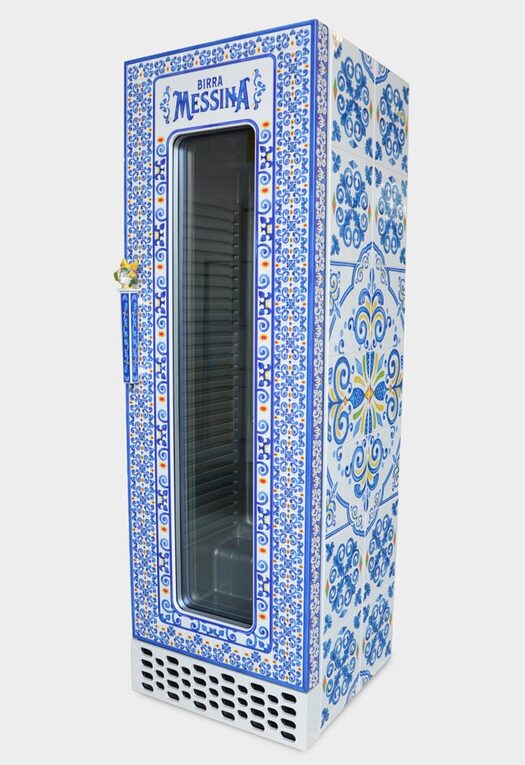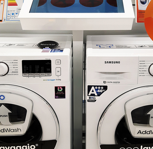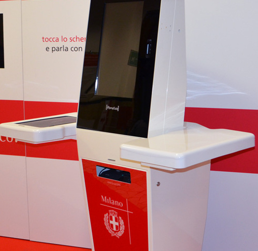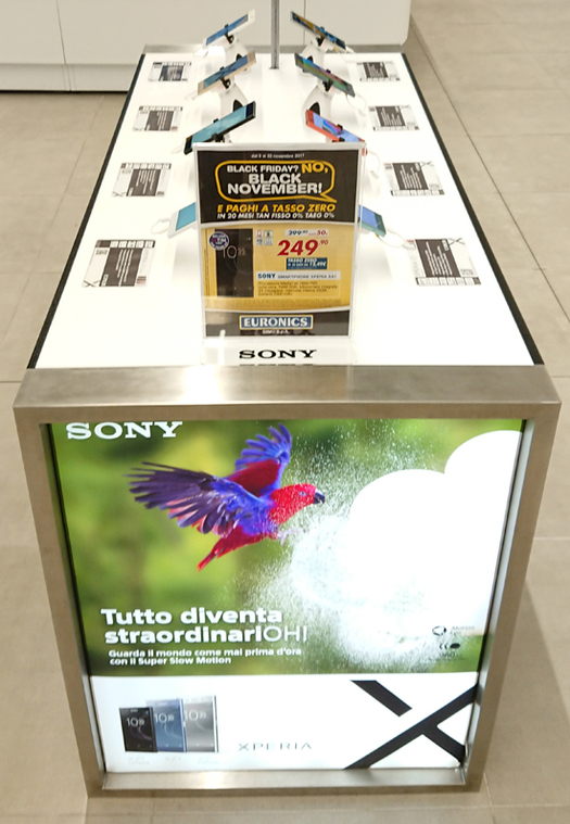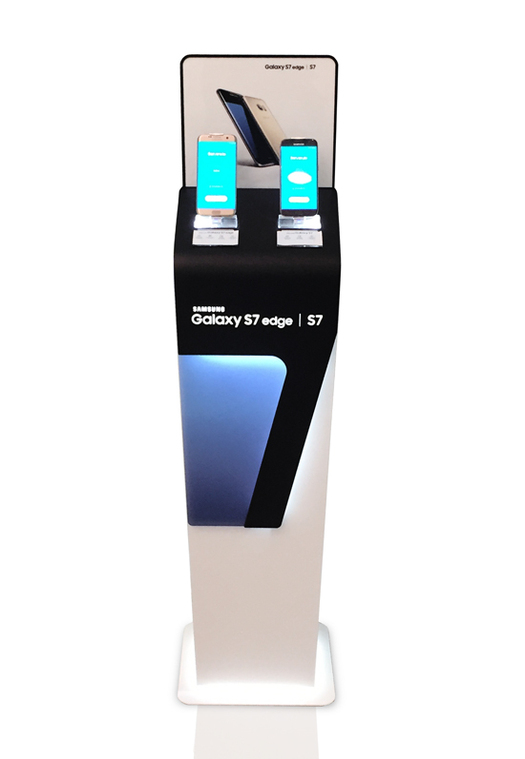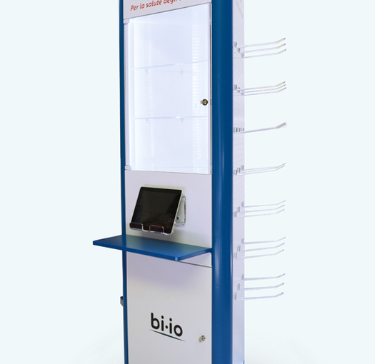 Espositore da terra in lamiera verniciata, vetrina luminosa, vano contenitore con anta, predisposizione per broche, porta tablet, ripiani riposizionabili e personalizzazioni con prespaziati resinati. (Designed by Spotbreack)