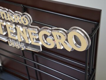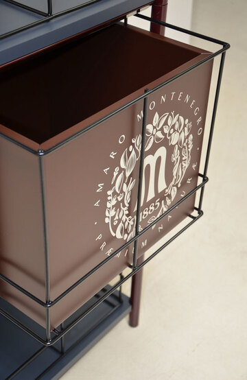 - espositore per bottiglie sviluppato su tre livelli in tubolare verniciato e ripiani in legno laccato. Crowner e ceste in tondino di ferro, cassetta in legno brandizzato stampato. In testa al totem espositore applicazione del logo 3D in PMMA trasparente stampato per una maggiore profondità visiva;