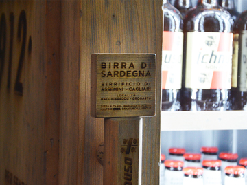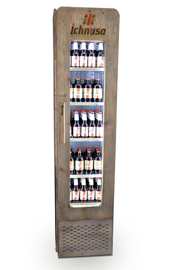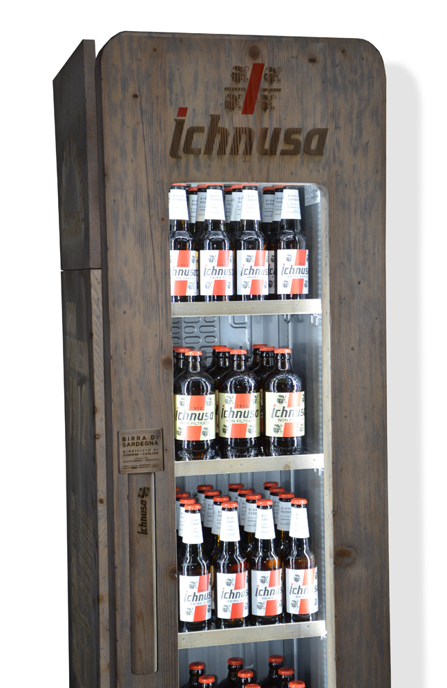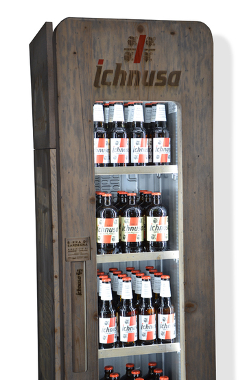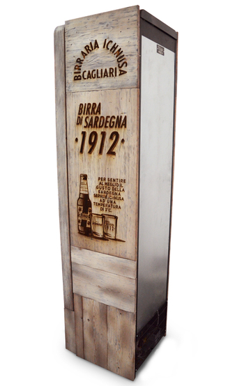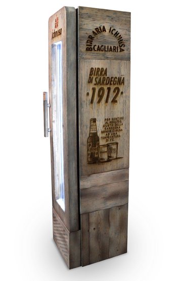 Personalizzazione frigorifero con rivestimento in legno anticato, loghi e grafiche incisi a caldo